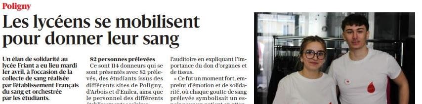 Le Progrès – 04/04/2025 – Poligny – Les lycéens se mobilisent pour donner leur sang