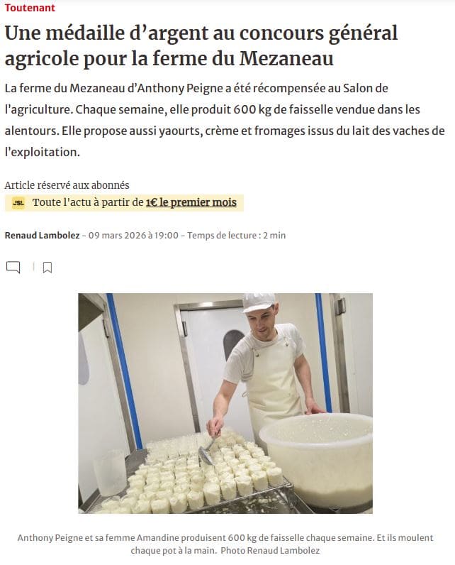 Le Journal de Saône-et-Loire – 09/03/2026 – Toutenant – Une médaille d’argent au concours général agricole pour la ferme du Mezaneau
