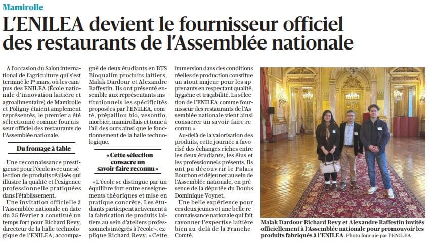 Est Républicain – 10/03/2026 – Mamirolle – L’ENILEA devient le fournisseur officiel des restaurants de l’Assemblée nationale